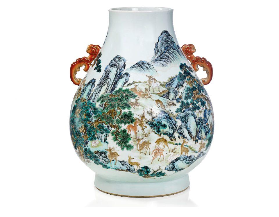 De forme pansue, il est délicatement orné d’un décor continu représentant une horde de cerfs, biches et daims au pelage finement émaillé, gambadant, se reposant, jouant, dans un paysage rocailleux agrémenté de grands pins tortueux, branchages de lingzhi, de pêches, parcouru par une rivière, des montagnes se dessinant au fond. Les anses sont moulées en forme de chilong stylisés émaillées rouge de fer et or.